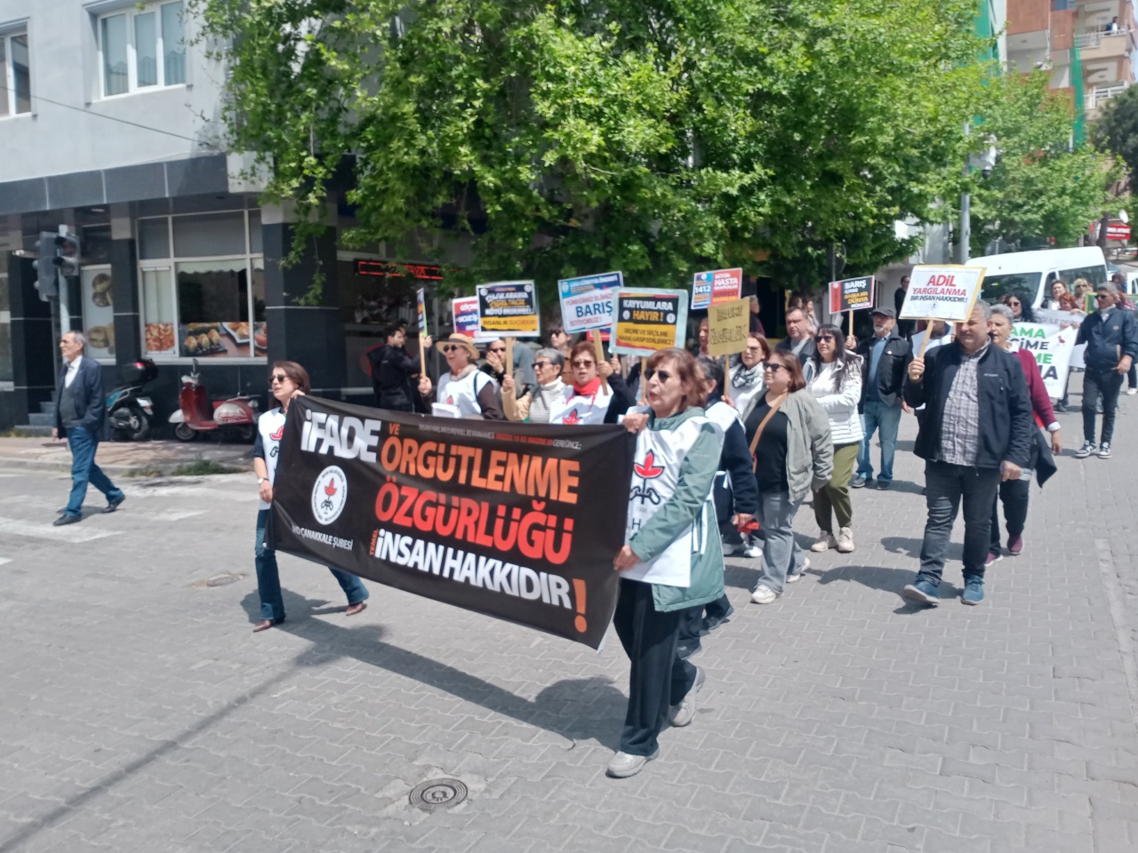1 Mayıs kutlamaları için Salı Pazarı mevkiinde toplanan sendikalar, meslek odaları, STK’lar, siyasi partiler ve gruplardan oluşan kortej, sloganlar ve şarkılar eşliğinde yürüdü.