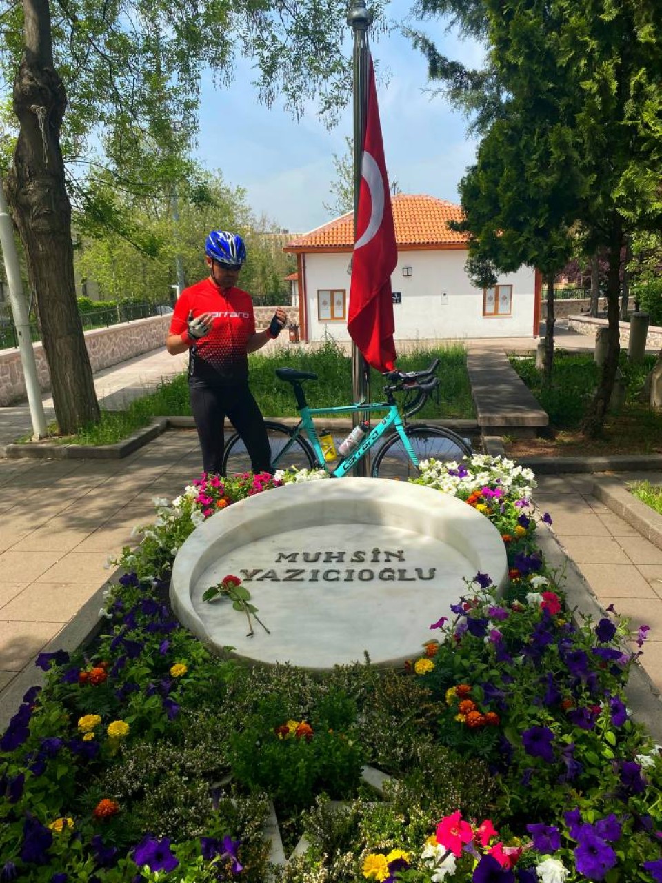 Demir atımı efsane lider, ömrünü Türk-İslam davasına adamış rahmetli Muhsin Yazıcıoğlu'nun kabrine pedalladım. Şehitler diyarı Çanakkale’mizden hayır dualar getirdim. Nizam-ı Âlem Davası’nı yayabilmek, bu uğurda Cenab-ı Allah'ın rızasını kazanabilmek için, çile ve işkenceyle geçen gençliğini ve milleti için harcanmış tertemiz ömrünü, şehadetiyle de tescillemiş, aşkı sadece vatan olan lider Muhsin Yazıcıoğlu’nu mezarı başında rahmetle ve minnetle anıyorum. Ve bir kez daha anladım ki Ölürse ten ölür Canlar ölesi değil. Ruhun şad olsun, mekânın cennet-i âlâ olsun İnşallah.” dedi.