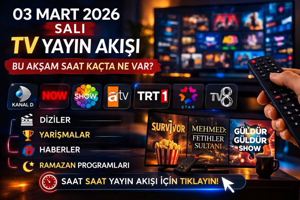 03 Mart 2026 Salı günü televizyon kanallarında dizi, yarışma, haber ve Ramazan programları ekranlara geliyor. Kanal D, NOW TV, Show TV, ATV, TRT 1, Star TV ve TV8’in yayın akışı belli oldu. İşte saat saat TV yayın akışı…