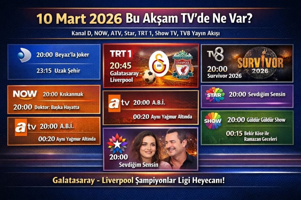10 Mart 2026 yayın akışı listesi belli oldu! Bu akşam Kanal D’de Beyaz’la Joker, TV8’de Survivor 2026 heyecanı yaşanırken; TRT 1 ekranlarında Galatasaray - Liverpool Şampiyonlar Ligi maçı nefesleri kesecek. İşte iftar ve sahur programlarını da kapsayan tüm kanalların saat saat program listesi.
