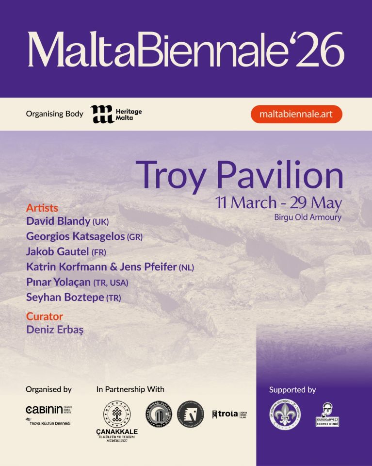 2.Malta Bienali’nin resmi programı kapsamında, Çanakkale Bienali tarafından hayata geçirilen Troya Pavyonu, 11 Mart – 29 Mayıs 2026 tarihleri arasında Old Armoury Birgu’da uluslararası izleyiciyle buluşuyor. Küratörlüğünü Deniz Erbaş’ın üstlendiği sergi, sanatçıların Çanakkale’de ürettiği çalışmaları bir araya getirerek Troya’yı tarihsel bir miras olmanın ötesinde, Akdeniz’in güncel sanatsal ve düşünsel üretimleri için canlı bir referans alanı olarak konumlandırıyor. David Blandy, Georgios Katsagelos, Jakob Gautel, Katrin Korfmann & Jens Pfeifer, Pınar Yolaçan ve Seyhan Boztepe’nin yapıtları, Troya’nın çok katmanlı kültürel ve simgesel dünyasına dair çağdaş bir okuma sunuyor.