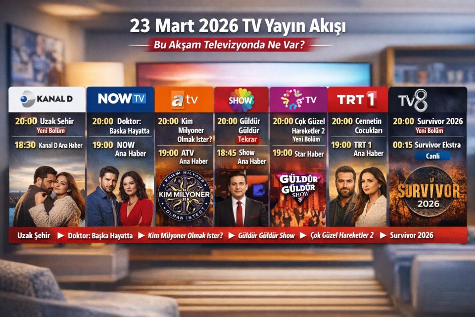 Televizyon tutkunları için haftanın ilk günü olan 23 Mart 2026 Pazartesi ekranlar yine dopdolu. Kanalların akşam kuşağında iddialı dizilerin yeni bölümleri, reyting rekortmeni yarışmalar ve güncel haber bültenleri yer alıyor. "Bugün TV'de ne var?" sorusuna yanıt arayanlar için Kanal D'den TV8'e, TRT 1'den NOW TV'ye kadar tüm ana kanalların sabah, öğle ve akşam saatlerindeki program listesini sizler için derledik.