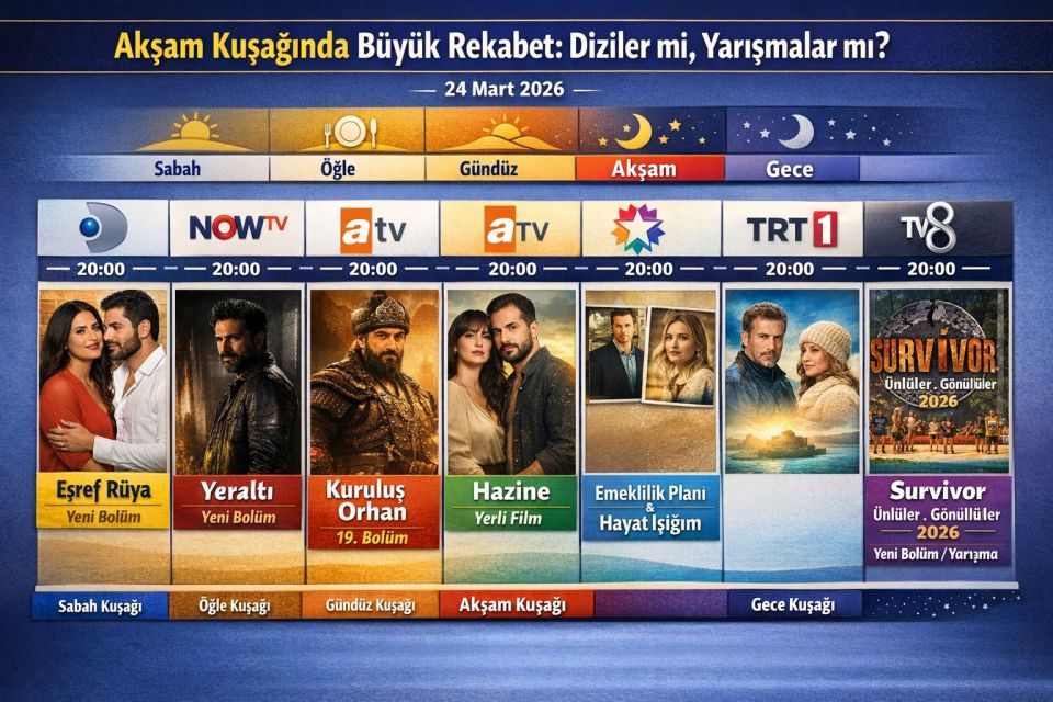 Ekran başında vakit geçirmeyi seven izleyiciler için bugün (24 Mart 2026) televizyon kanalları dopdolu bir içerik yelpazesi sunuyor. Sabah kuşağındaki canlı yayınlardan akşamın reyting rekortmeni dizilerine, Ramazan ayına özel sohbetlerden dünya sinemasının seçkin örneklerine kadar pek çok seçenek izleyiciyle buluşuyor. Özellikle akşam kuşağında yaşanacak kıyasıya rekabet, izleyicileri şimdiden heyecanlandırıyor.