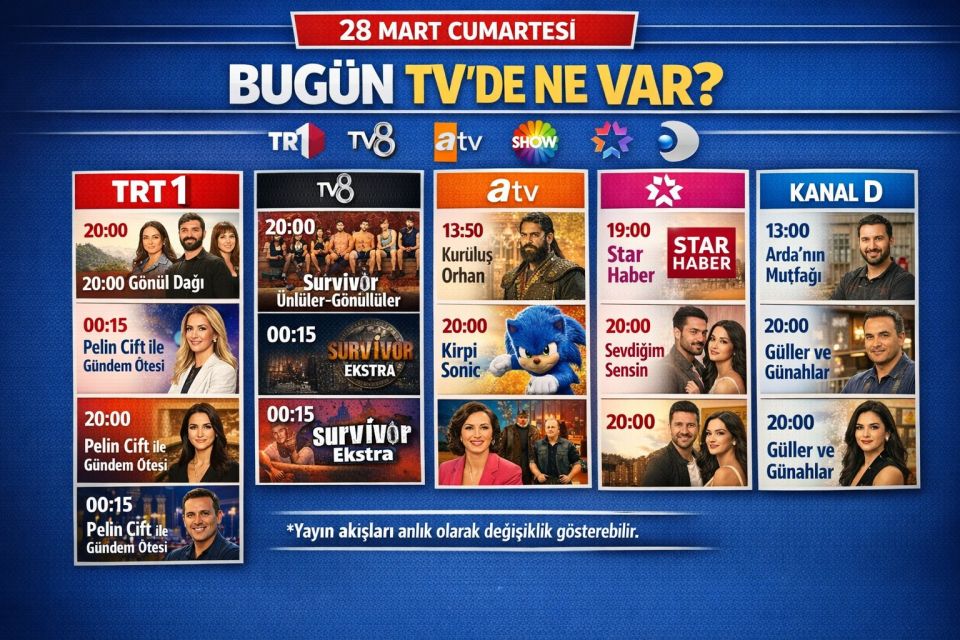 Hafta sonunun tadını televizyon başında çıkarmak isteyen izleyiciler, "Bugün kanallarda ne var?" sorusuna yanıt arıyor. 28 Mart Cumartesi günü, Türkiye’nin en çok izlenen televizyon kanalları zengin içerikleriyle izleyici karşısına çıkıyor. Sabah kuşağındaki magazin programlarından akşam kuşağındaki iddialı dizilere ve canlı yarışmalara kadar tüm detayları sizler için derledik.