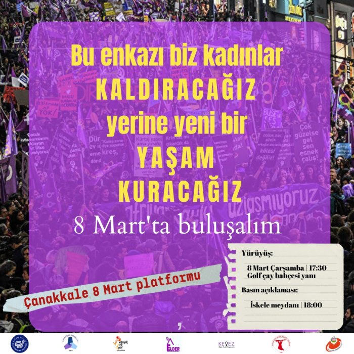 Açıklamada son olarak şu sözlere yer verildi, "Nasıl ki normal zamanda kadınların yaşadıklarına kör, sağır, dilsizlerse, afet ortasında da kör sağır dilsiz olduklarını gördük. İşçileri, kadınları, çocukları göz göre göre ölüme gönderenler, hepimizi aynı enkazın altında sesimizi duyulmaz halde bırakmak isteyenler... Bunların hepsini tanıyoruz, biliyoruz. Hepsinin arasındaki bağı görüyoruz. Biz dayanıştığımızda neleri başarabileceğimizi de hep birlikte gördük, görüyoruz. Tek bir ağızdan söylüyoruz, `Yeni bir yaşamı birlikte kuracağız.` Dayanışmayı büyütmek, yasımızı birlikte tutmak, öfkemizi birlikte haykırmak için Bütün Çanakkale`li kadınlara çağrımızdır; 8 Mart 2023 Çarşamba günü Saat:17.30`da Golf Çay Bahçesinden yürüyerek İskele Meydanında basın açıklaması yapıyoruz"