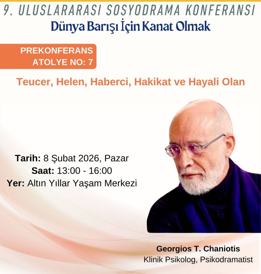 “Dünya Barışı İçin Kanat Olmak” sloganıyla çalışmaları yürütülen 9. Uluslararası Sosyodrama Konferansı öncesinde düzenlenen ön konferans atölyeleri kapsamında, klinik psikolog ve psikodramatist Georgios T. Chaniotis ile yürütülecek “Teucer, Helen, the Messenger, Truth and the Imaginary” başlıklı çalışma, 8 Şubat 2026 Pazar günü 13.00-16.00 saatleri arasında Altın Yıllar Yaşam Merkezi'nde gerçekleşecek.