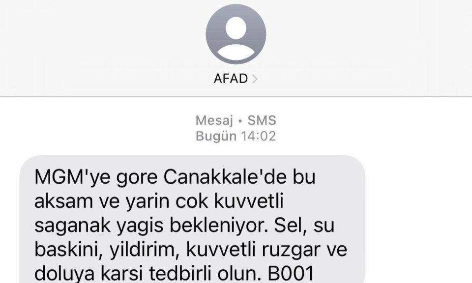 Meteoroloji Genel Müdürlüğü, bu akşam ve yarın için Çanakkale'de çok kuvvetli yağış olacağını bildirmişti. Afet ve Acil Durum Yönetimi Başkanlığı (AFAD) da Çanakkale'de yaşayan vatandaşlara SMS yoluyla bilgilendirme yaparak; sel, su baskını, yıldırım, kuvvetli rüzgar ve doluya karşı tedbirli olmalarını istedi.