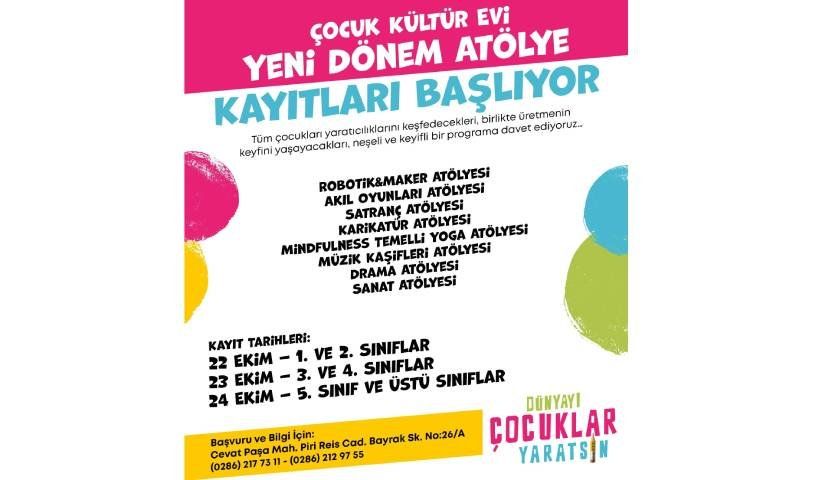 Veliler, atölyeler ve kayıt süreci hakkında detaylı bilgi almak için Cevatpaşa Mahallesi Piri Reis Caddesi Bayrak Sokak NO: 26/A adresinde bulunan Çocuk Kültür Evi’ni ziyaret edebilir ya da 0 286 217 73 11 ve 0286 212 97 55 numaralı telefonlardan ulaşabilirler.