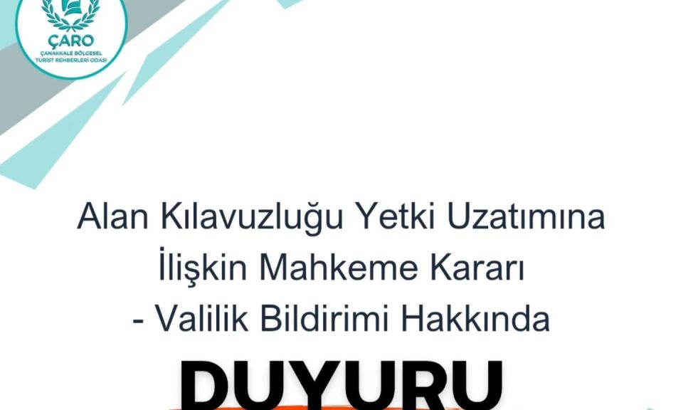 Çanakkale Bölgesel Turist Rehberleri Odası (ÇARO) tarafından daha önce kamuoyuyla paylaşıldığı üzere açılan dava sonuçlandı. Çanakkale 1. İdare Mahkemesi, Çanakkale Valiliği tarafından gerçekleştirilen alan kılavuzluğu yetki uzatımının iptaline karar verdi.
