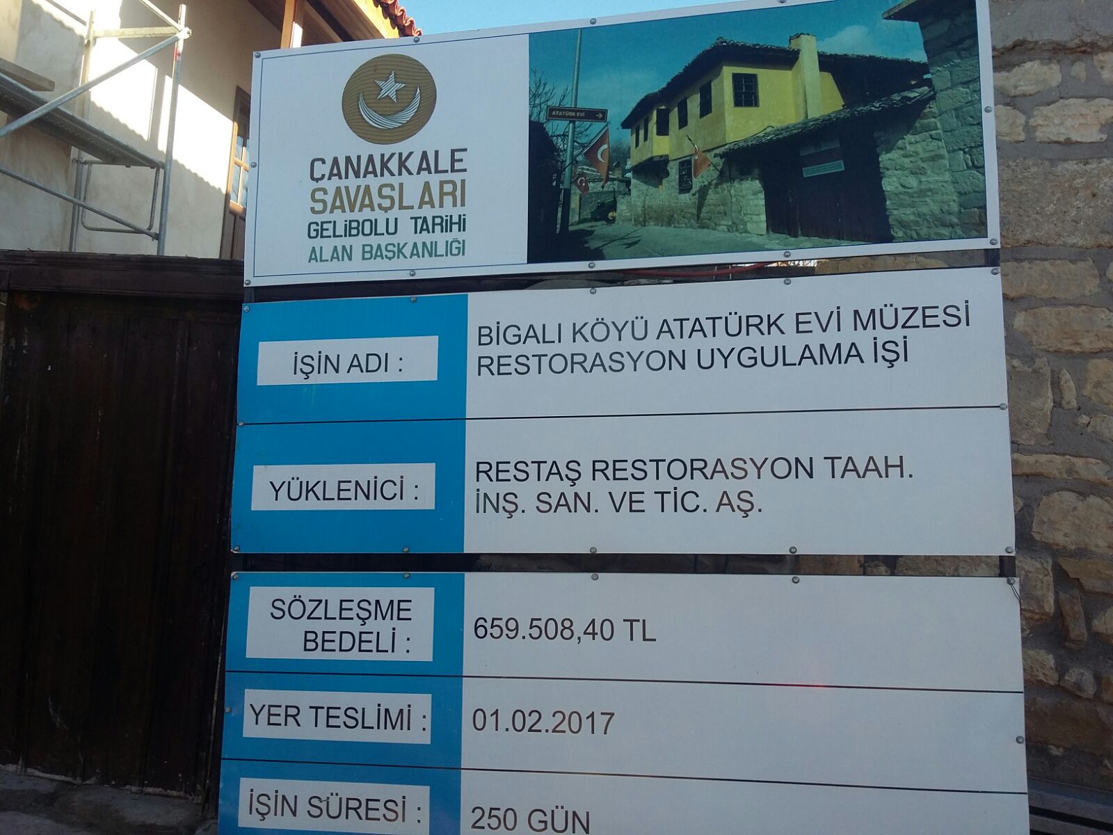 Çanakkale Savaşları sırasında Mustafa Kemal tarafından kullanılan ve restorasyonu tartışma konusu olan ve çalışmaların 2017 Eylül ayında bitirilmesi gereken Bigalı Köyü'ndeki ev, 2018 Mart ayına gelmesine rağmen tamamlanamadı.