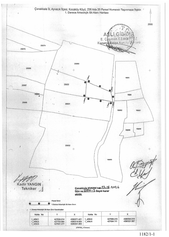 Çanakkale İli, Ayvacık İlçesi, Kocaköy Köyü'nde yer alan, özel mülkiyete ait, tarla niteliğindeki, kısmen 235 ada 20 parsel numaralı taşınmazdaki kaya mezarının 2863 sayılı Yasa'nın 6. Maddesinde belirtile kriterleri taşıdığından I. Derece Arkeolojik Sit olarak tesciline, karar eki tescil fişi ve sit sınırlarını gösterei 1/2000 ölçekli koordinatlı haritanın uygun olduğuna, ilgili tapu Müdürlüğünce 235 ada 20 parsel numara i taşınmazın tapu kütüğünün beyanlar hanesine "Bir kısmı I. Derece Arkeolojik Sitte kalmaktadır." şeklinde kayıt konulmasına, I. Derece arkeolojik sit sınırlarına yönelik koruma amaçlı imar planı yapılıncaya kadar alana ilişkin Geçiş Dönemi Koruma Esasları ve Kullanma Şartlarının ekteki haliyle üç (3) yıl süreyl belirlenmesine, I. derece arkeolojik sit sınırlarına ilişkin ilgili kolluk kuvveti ve idarelerce gerekli güvenlik önlemlerinin alınmasına karar verildi."