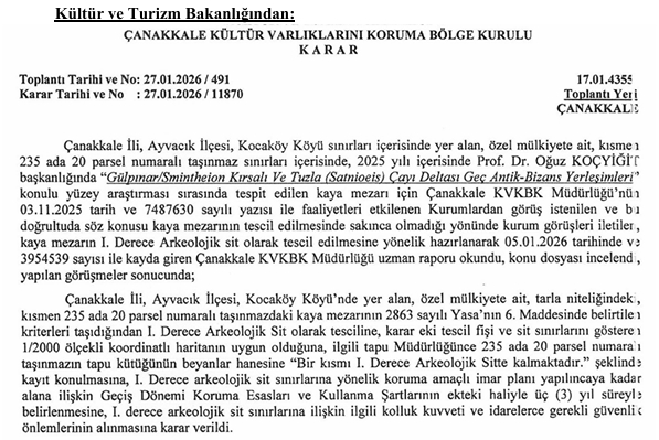 Çanakkale Kültür Varlıklarını Koruma Bölge Kurulunun 27.1.2026 tarih ve 11870 nolu kararında şu ifadeler yer aldı: