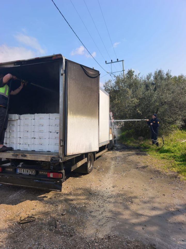 Olay, Ayvacık ilçesinin Behram köyü istikametinden Ayvacık’ın Küçükkuyu istikametine gitmekte olan H.L. idaresindeki 10 AIN 783 plakalı balık yüklü kamyonet, Ahmetçe köyü sahil yolunda alev aldı. Çıkan yangın sonrasında durum itfaiye ekiplerine bildirildi. İtfaiye ekipleri yangına müdahale etti. Yanan kamyonette maddi hasar oluştu.