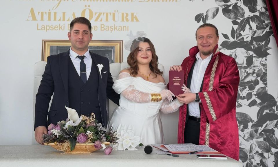 Lapseki Belediye Başkanı Atilla Öztürk, Belediye Nikah Salonu’nda düzenlenen törende Büşra Keskin ile Emre Kılıç’ın nikahını kıydı. Nikah törenine aileler ve yakın dostlar katılırken, salonda duygulu anlar yaşandı.