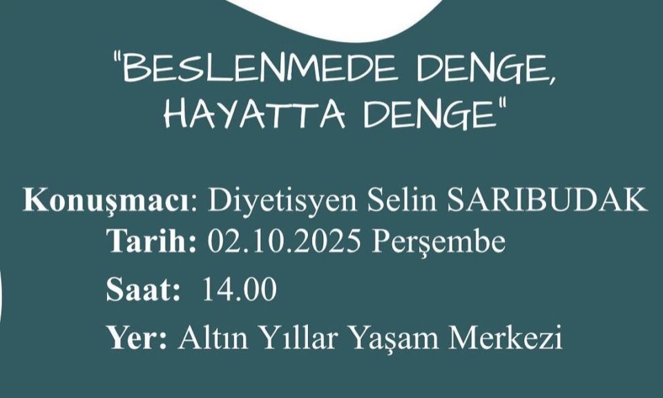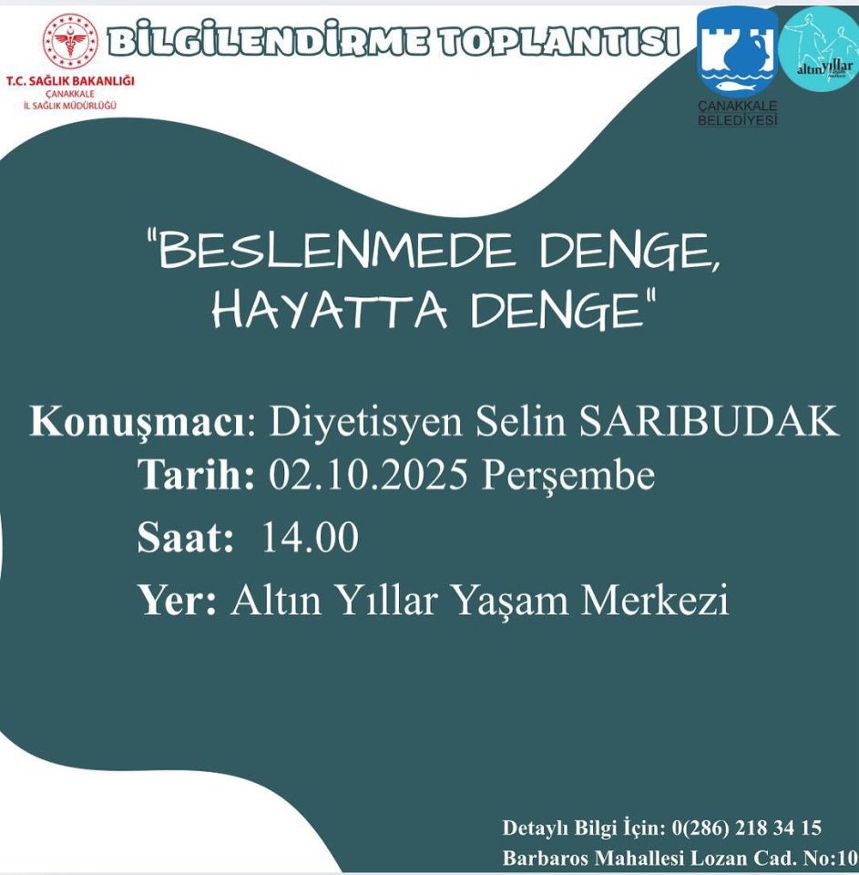 Çanakkale İl Sağlık Müdürlüğü Sağlıklı Beslenme ve Hareketli Hayat Birimi Diyetisyen Selin Sarıbudak tarafından Altın Yıllar Yaşam Merkezi'nde bir söyleşi gerçekleştirilecek.