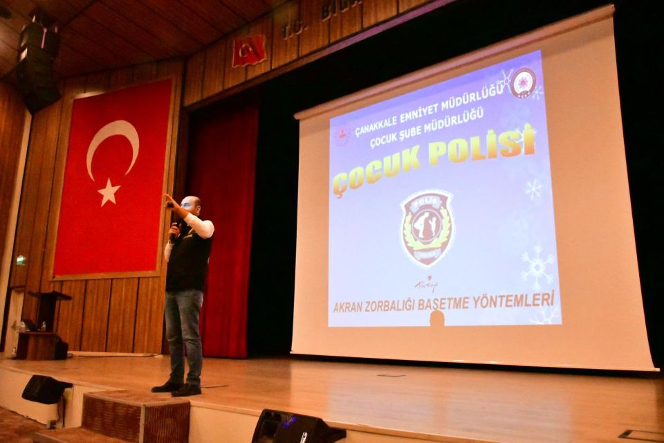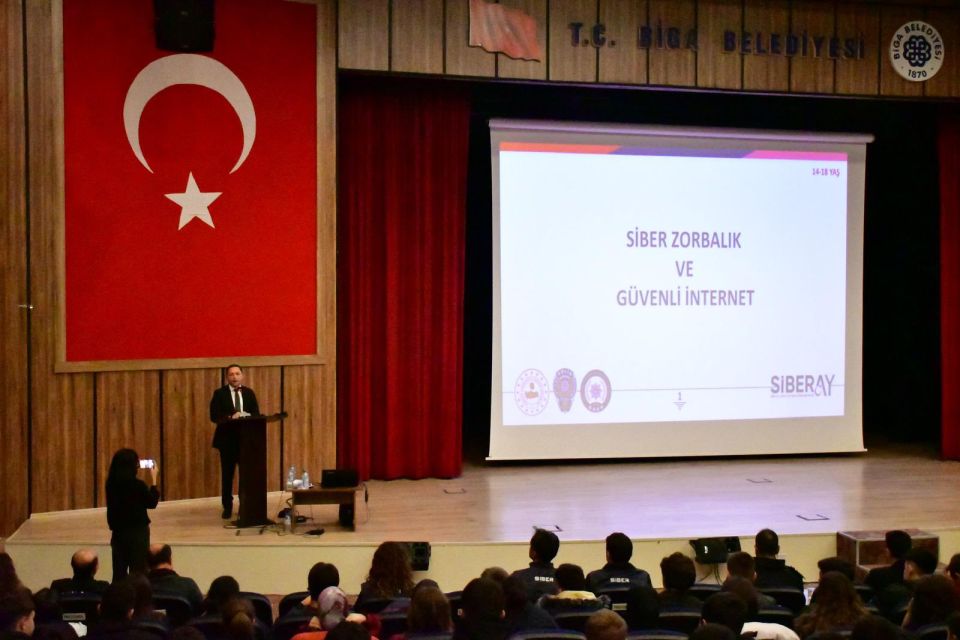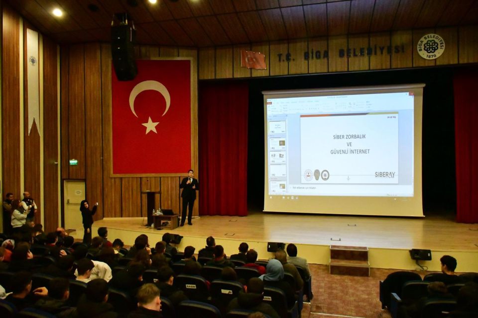 Biga Atatürk Kültür Merkezinde Çanakkale İl Emniyet Müdürlüğü tarafından lise öğrencilerine yönelik olarak akran zorbalığı ve siber suçlar hakkında bir seminer düzenlendi.