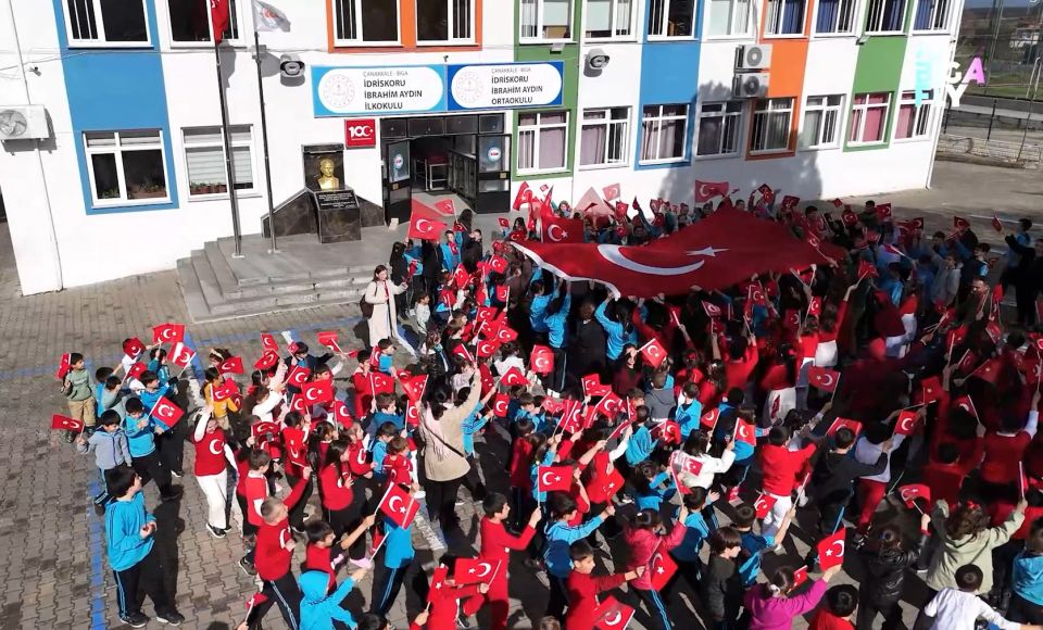 Milli Eğitim Bakanlığı koordinasyonunda ülke genelindeki tüm okullarda eş zamanlı olarak uygulanan “Bayrak Sevgisi” teması, Biga’da anlamlı bir etkinlikle hayat buldu. İdriskoru İbrahim Aydın İlkokulu ve Ortaokulu öğretmen ve öğrencilerinin katılımıyla gerçekleştirilen etkinlikte, okul bahçesi adeta bayraklarla süslenen bir şölen alanına dönüştü.