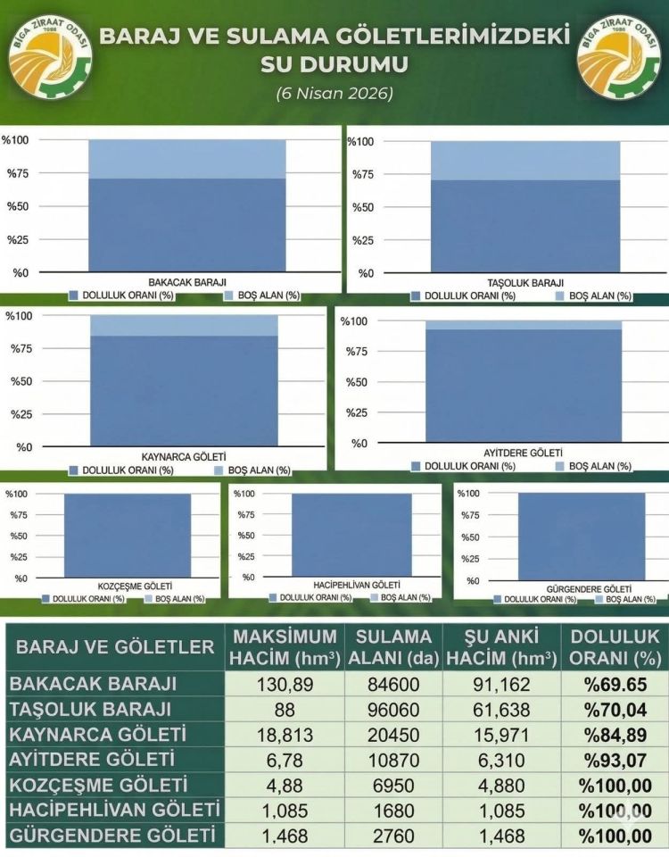 6 Nisan 2026 Biga Ovası Sulama Birliği bünyesinde baraj ve göletlerdeki doluluk seviyeleri şöyle: