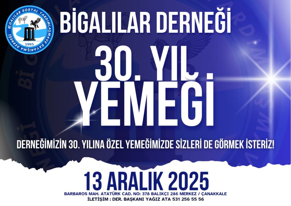 Bigalılar Sosyal Yardımlaşma ve Dayanışma Derneği, kuruluşunun 30. yılını düzenleyecekleri organizasyon ile kutlayacak. 13 Aralık 2025 Cumartesi akşamı düzenlenecek yemek ile ilgili çağrıda bulunan Dernek Başkanı Yağız Ata, “Bigalılar Sosyal Yardımlaşma ve Dayanışma Derneğimizin 30. yılını 13 Aralık Cumartesi günü hep beraber Balıkçı 286'da kutluyoruz. Tüm hemşerilerimizi bekleriz.” dedi.