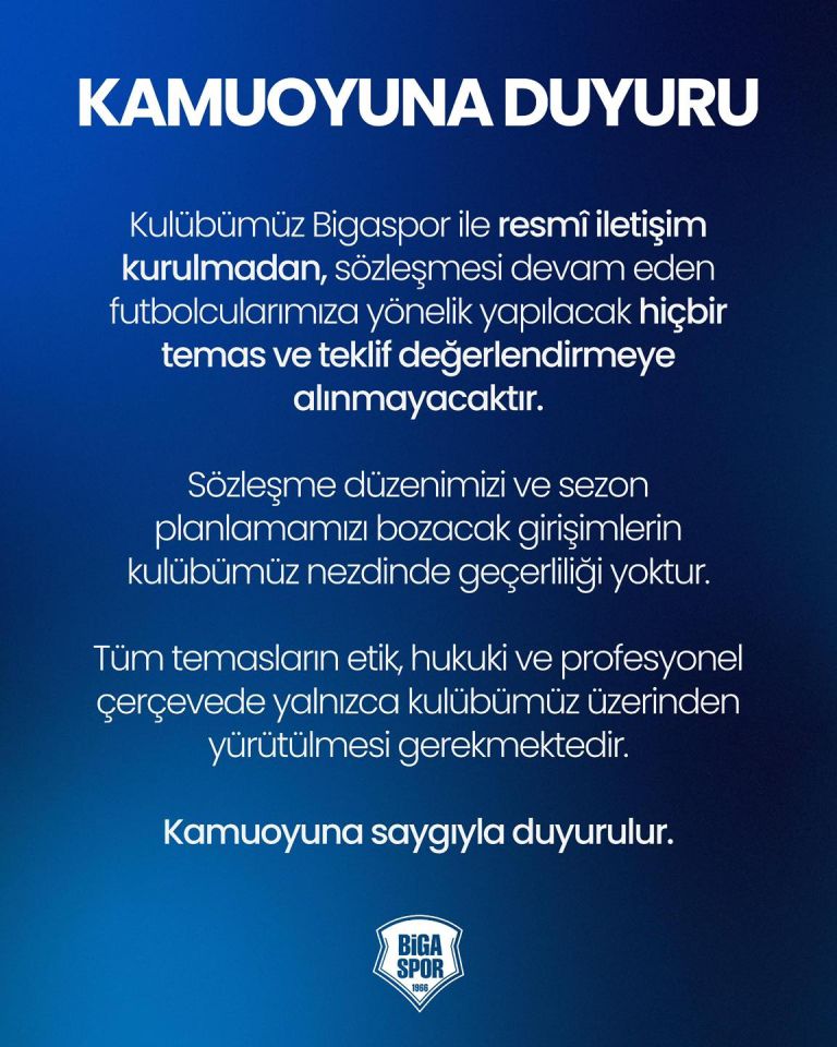 “Kulübümüz Bigaspor ile resmî iletişim kurulmadan, sözleşmesi devam eden futbolcularımıza yönelik yapılacak hiçbir temas ve teklif değerlendirmeye alınmayacaktır.