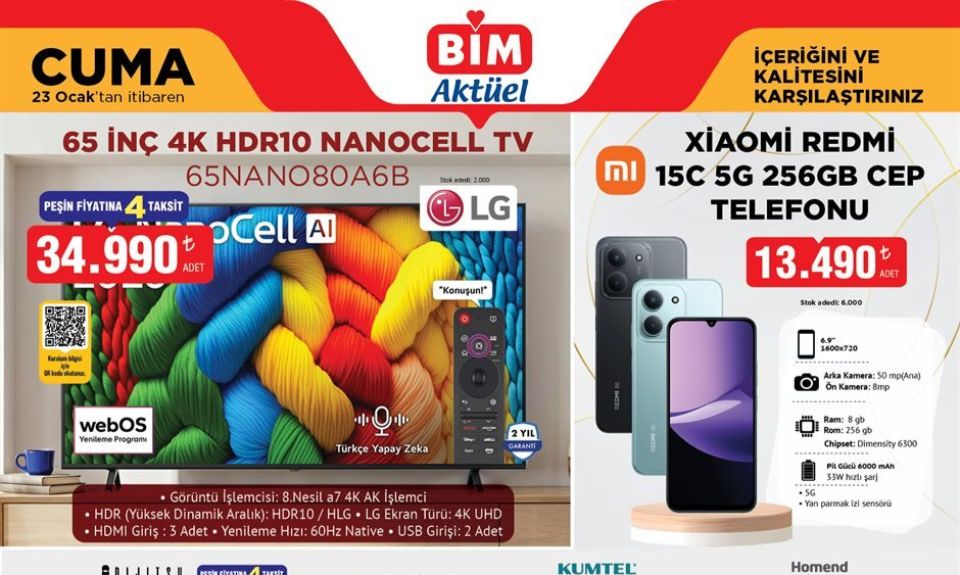 Türkiye'nin en büyük zincir marketlerinden BİM'in aktüel ürünlerinin yer aldığı kataloğu yayınlandı. Dikkat çeken ürünler arasında elektronik ev eşyaları, titreşimli masaj aletleri, spor kıyafetleri ve aletleri, çocuklar için peluş oyuncaklar yer alıyor.