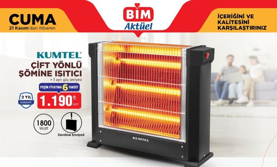 21 Kasım 2025 Cuma gününden itibaren geçerli olan BİM Aktüel Ürün kataloğu yayımlandı. Elektronik ve ev ürünlerinde cazip fırsatların bir araya geldiği katalogda Kumtel çift yönlü şömine ısıtıcı 1,190 TL, Dijitsu 65" QLED Google TV 22,950 TL’den alıcısını bekliyor.