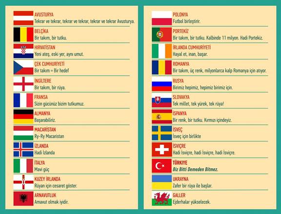 Avusturya`nın sloganın abartlı şekilde ``tekrar`` etmesi, Belçika, Çek Cumhuriyeti, Almanya, İzlanda ve İsviçre`nin sloganları ise sadelikten basitliğe düşmüş gibi görünüyor. Hırvatistan`ın sloganı zorlama olsa da en azından elle tutulur bir slogana yakışır ifadeler bütünlüğü var: ``Yeni ateş, eski yer, aynı umut.`` Macaristan`ın sloganını pek anlamadığımız için herhangi bir yorumda getiremiyoruz açıkcası. Arnavutluk`un şampiyona`ya katılması büyük bir başarı öyküsü zaten, ancak sloganına baktığımız da, biraz enteresan bir ifade ile karşılaşıyoruz: ``Arnavut olmak iyidir.`` Rusya`nın sloganı ise hemen hemen herkesin bildiği çocukluğunda mahalle maçlarında elleri üst üste koyup söylenen o klişe: ``Hepimiz birimiz, hepimiz birimiz için.`` Ukrayna ve Galler için aynı şeyler söyleyenemez çünkü gayet başarılı sloganlar olduğu kesin. Ukrayna: ``Zafer bir rüya ile başlar.`` Diyor ve gayet hedefi 12`den vuruyor gibi. Galler`in sloganı ise ülke bayraklarına atıfta bulunuyor gibi, ancak dünya henüz o kadar fantastik değil: ``Ejderhalar yükselecek.`` Daha önceki avrupa şampiyonalarında sloganlar kullanılmış mıydı pek emin değiliz, ancak bu sloganlar futbolda başarının gidişatını ne kadar etkileyecek veya futbolculara ne kadar ruh katacak bilemiyoruz. Türkiye`nin sloganına baktığımız da ise tam bir yaşanmışlıktan ortaya çıkan en karizmatik, en güzel ve en başarılı slogan olduğunu rahatlıkla ifade edebiliriz: ``Biz bitti demeden bitmez.`` Son dakika gollerimizden doğduğunu düşündüğümüz bu sloganın, hep akıllara o efsanevi Semih Şentürk`ü golünü getiriyor.