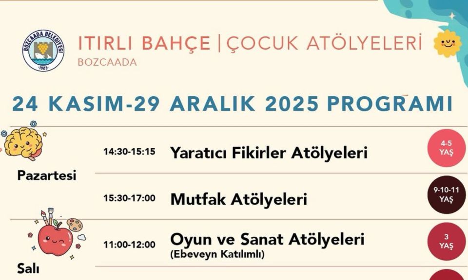 Bozcaada Belediyesi, 24 Kasım–29 Aralık 2025 tarihleri arasında Itırlı Bahçe’de çocuklar için özel atölye programları düzenliyor. Gönüllü eğitmenlerin katkılarıyla gerçekleştirilen atölyelerde, çocuklar hem eğleniyor hem de öğreniyor.