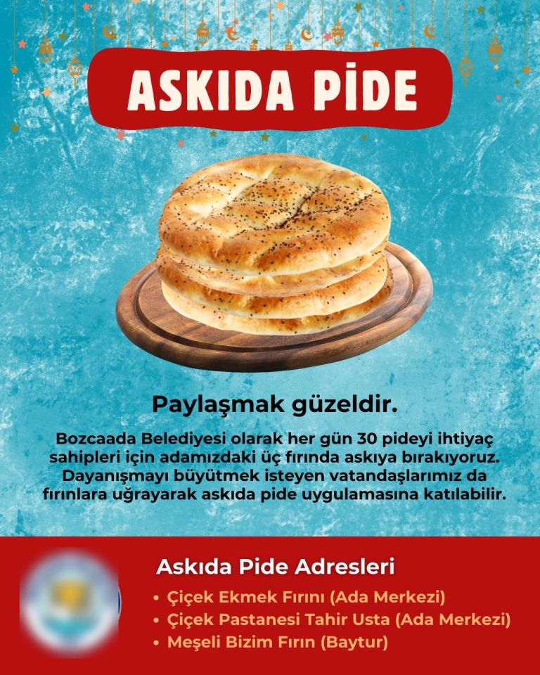 Geçtiğimiz yıl başlatılan Askıda Pide uygulamasının bu yıl da devam ettiği Bozcaada'da, belediye tarafından her gün 30 adet pide adadaki üç fırında ada halkı için ayrılıyor.