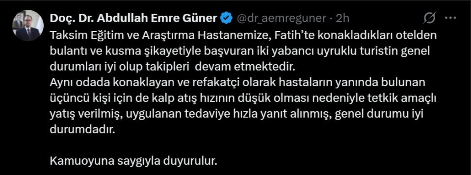 "Taksim Eğitim ve Araştırma Hastanemize, Fatih’te konakladıkları otelden bulantı ve kusma şikayetiyle başvuran iki yabancı uyruklu turistin genel durumları iyi olup takipleri devam etmektedir. Aynı odada konaklayan ve refakatçi olarak hastaların yanında bulunan üçüncü kişi için de kalp atış hızının düşük olması nedeniyle tetkik amaçlı yatış verilmiş, uygulanan tedaviye hızla yanıt alınmış, genel durumu iyi durumdadır. Kamuoyuna saygıyla duyurulur."