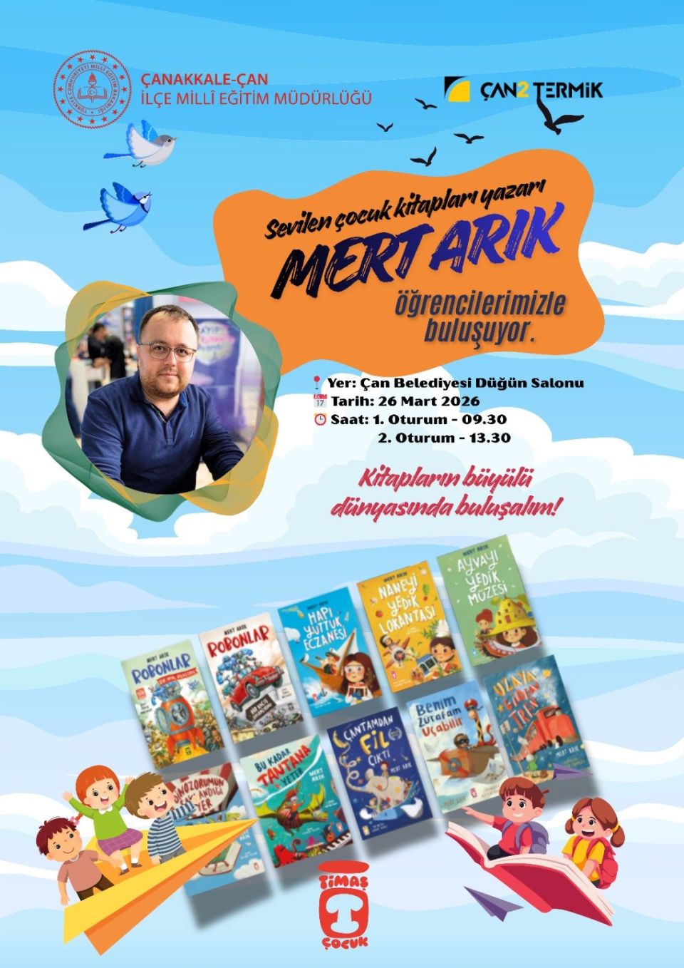 Çan’da çocukların kitap sevgisini artırmaya yönelik önemli bir etkinlik daha hayata geçiriliyor. Çan2 Termik Santrali desteği ve Çan İlçe Milli Eğitim Müdürlüğü iş birliğiyle düzenlenen imza günü etkinliğinde, çocukların severek okuduğu yazar Mert Arık minik okurlarıyla bir araya gelecek.