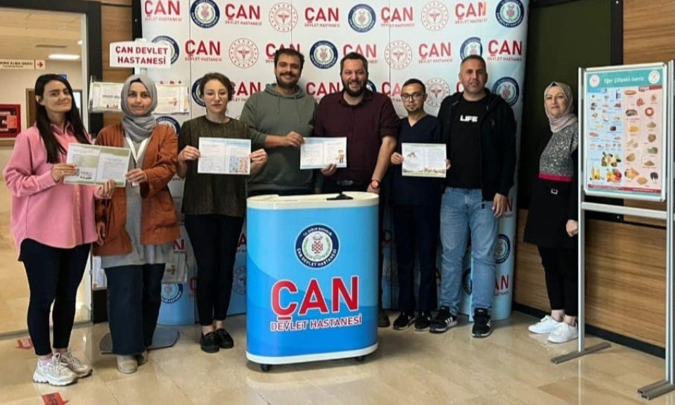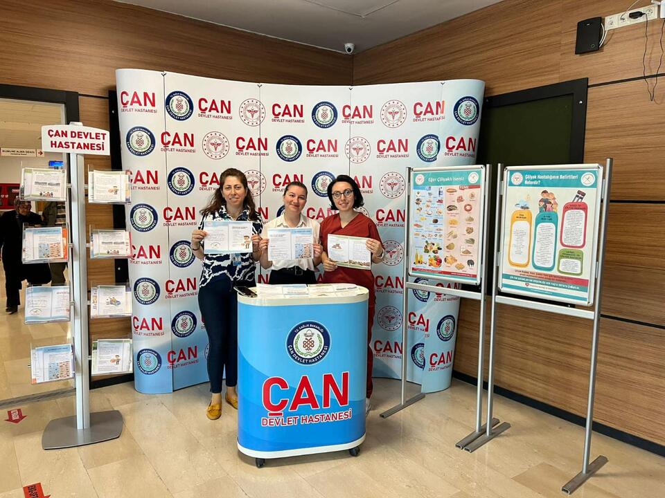 Çan Devlet Hastanesi’nde kurulan stantta, 9 Mayıs Dünya Çölyak Farkındalık Günü kapsamında hastalık hakkında bilgilendirme yapıldı. Hastanenin sosyal medya hesabından yapılan açıklamada; “Çölyak hastalığı ile ilgili halkımıza bilgilendirme yapmak ve farkındalık oluşturma amacı ile Başhekim Uzm. Dr. Hasan Alpay, Başhekim Yardımcımız Uzm. Dr. Fatma Kılıç, Sağlık Bakım Hizmetleri Müdürü Emine Kısa, İç Hastalıkları Uzmanlarımız Uzm. Dr. Recep Alperen Torun, Uzm. Dr. Erdal Mert, Hastanemiz Diyetisyenleri Betül Gözütok Dinç, Büşra Akseli öncülüğünde ve Çölyak Hastalığı tanısı olan çalışanımız Mehmet Damar ve Hastanemiz Eğitim Birimi tarafından konunun önemi anlatan stant açılarak, halkımıza bilgilendirmeler yaptık” ifadelerine yer verildi.