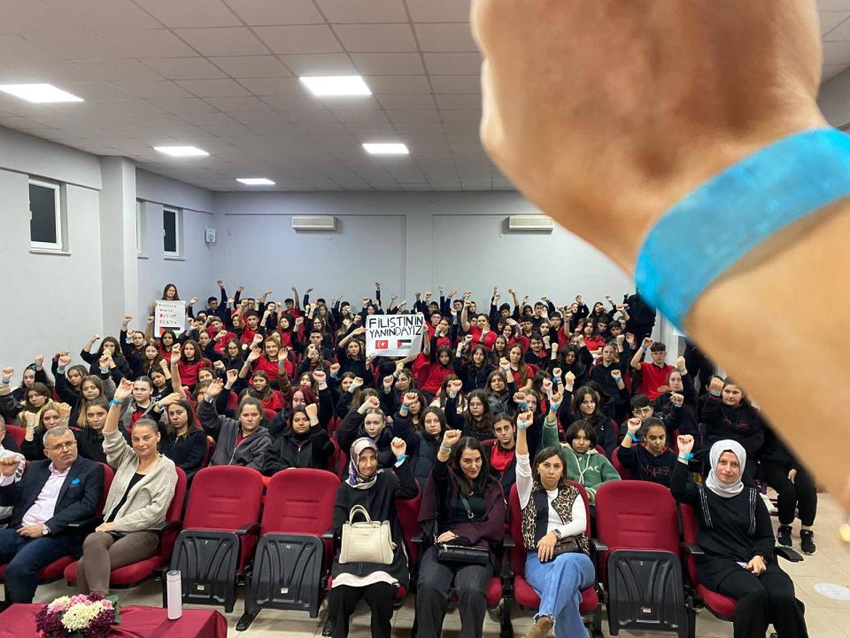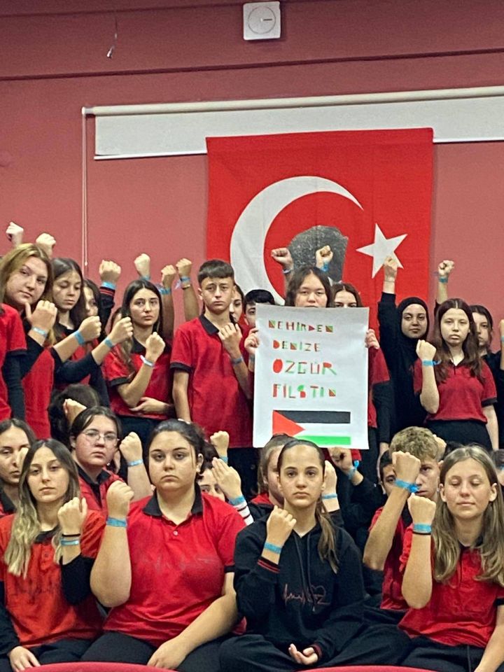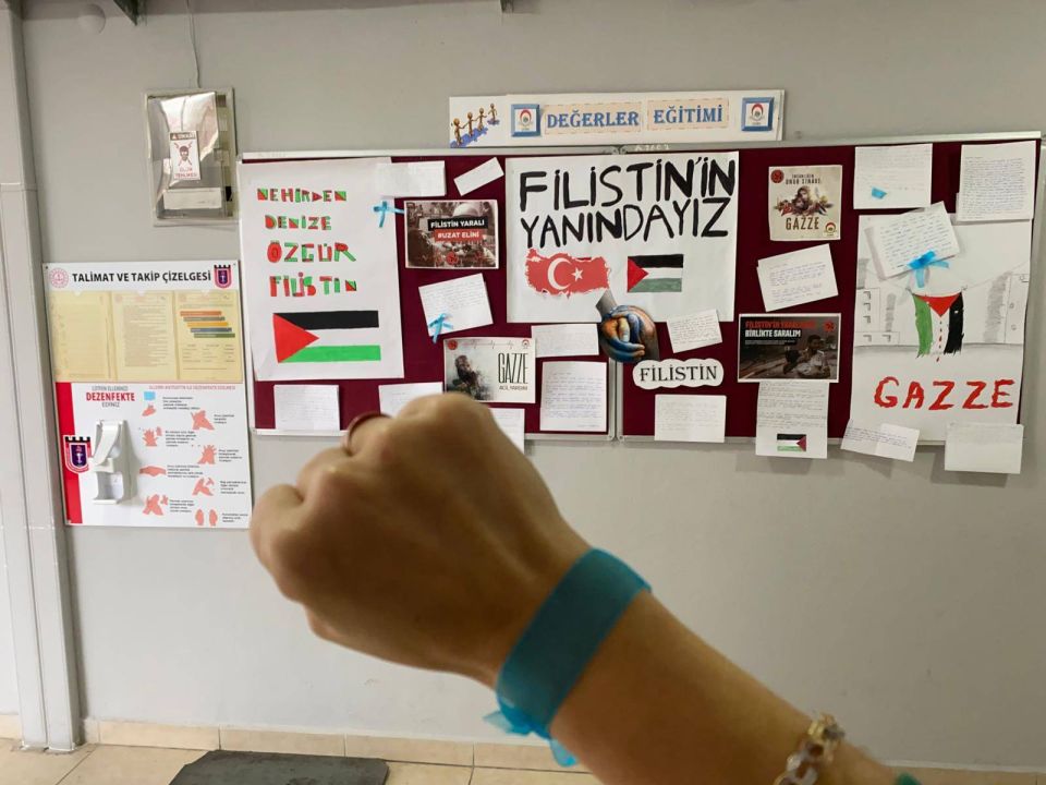 Öğrenciler, Filistinli kardeşlerine mektuplar yazarak ve hazırladıkları afişleri okul panolarında sergileyerek etkinliğe aktif katkı sağladı. Ayrıca, direnişin ve umudun simgesi olarak tüm öğretmen ve öğrencilere mavi kurdela bileklik dağıtıldı.