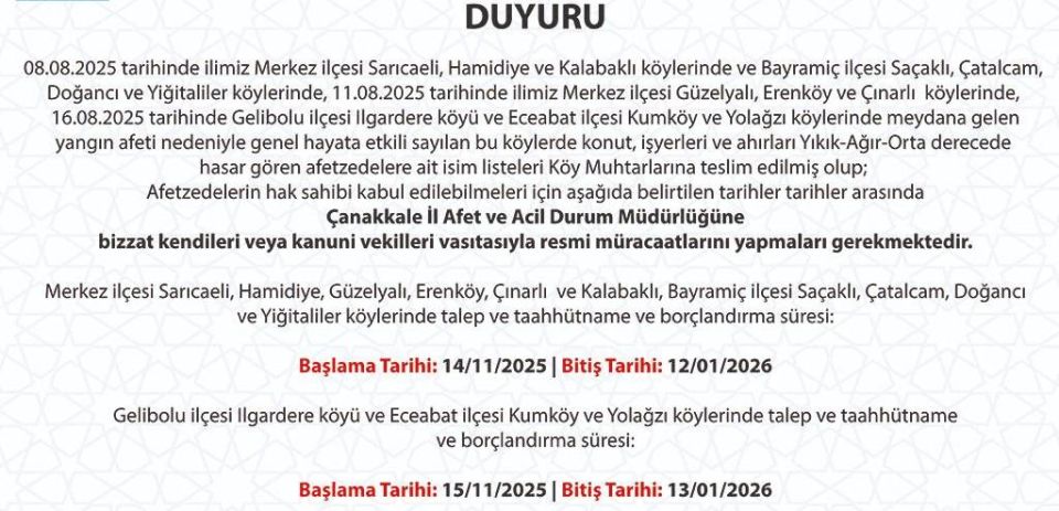 “Çanakkale İli, 08.08.2025 tarihinde Merkez İlçesi, Sarıcaeli, Hamidiye ve Kalabaklı köylerinde ve Bayramiç İlçesi, Saçaklı, Çatalcam, Doğancı ve Yiğitaliler köylerinde, 11.08.2025 tarihinde Merkez İlçesi, Güzelyalı, Erenköy ve Çınarlı köylerinde, 16.08.2025 tarihinde Gelibolu İlçesi, Ilgardere köyü ve Eceabat İlçesi, Kumköy ve Yolağzı köylerinde meydana gelen yangın afeti nedeniyle genel hayata etkili sayılan bu köylerde konut, işyerleri ve ahırları Yıkık-Ağır-Orta derecede hasar gördüğü 7269 sayılı Kanunun 13. üncü maddesine göre oluşturulan yetkili Fen Kurullarınca tespit edilen afetzedelere ait isim listeleri Köy Muhtarlarına teslim edilmiştir.
