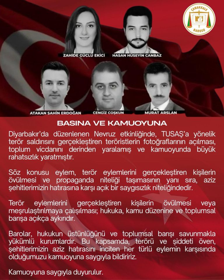 Çanakkale Barosu, Diyarbakır'da gerçekleştirilen Nevruz etkinliği sırasında TUSAŞ’a yönelik terör saldırısının faillerine ait fotoğrafların sergilenmesine ilişkin yazılı bir açıklama yayımladı. Baro yönetimi, söz konusu eylemin toplumsal vicdanı yaraladığını ve hukuk düzenine açık bir aykırılık teşkil ettiğini belirtti.