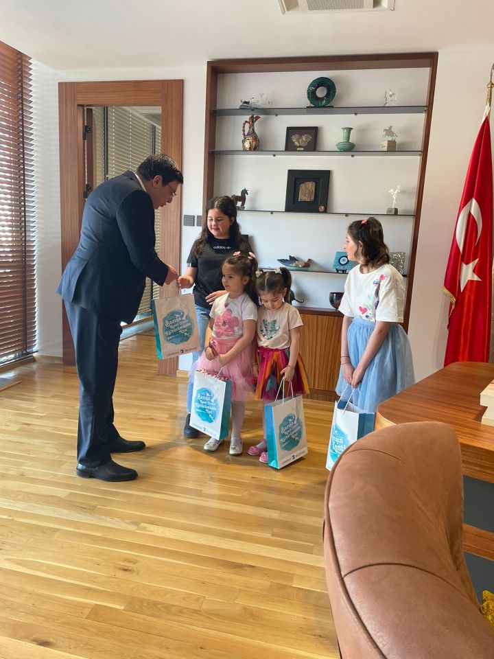 Ziyaret, Başkan Erkek'in Güneş Uyanık ve kardeşleri Asya, Zeynep ve Cemre'ye hediye takdimi ile sona erdi.