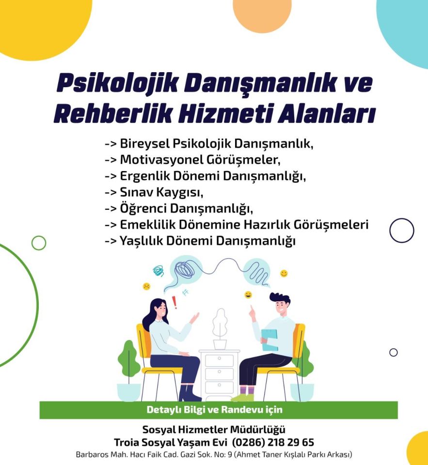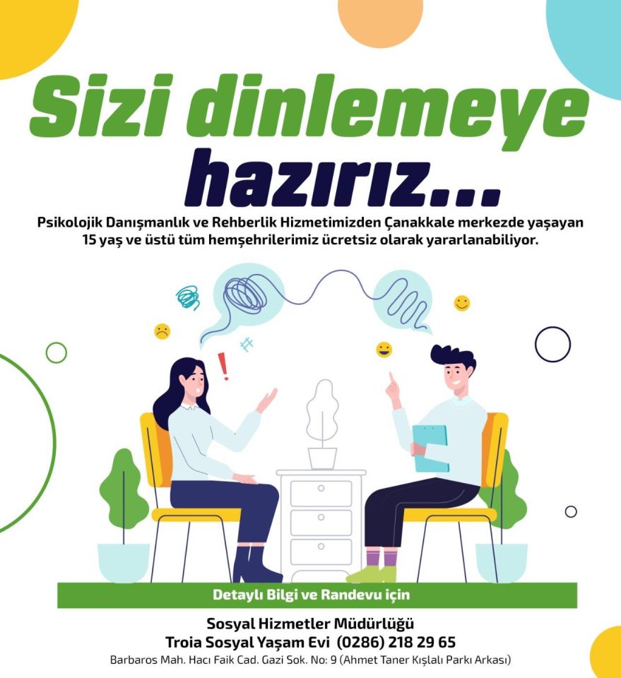 Çanakkale Belediyesi, Troia Sosyal Yaşam Evi bünyesinde yürütülen hizmet kapsamında; ergenlik sorunları, sınav maratonundaki gençlerin kaygıları ve yaşlılık döneminin getirdiği zorluklar başta olmak üzere pek çok konuda bireysel danışmanlık hizmeti ücretsiz olarak sunuluyor.