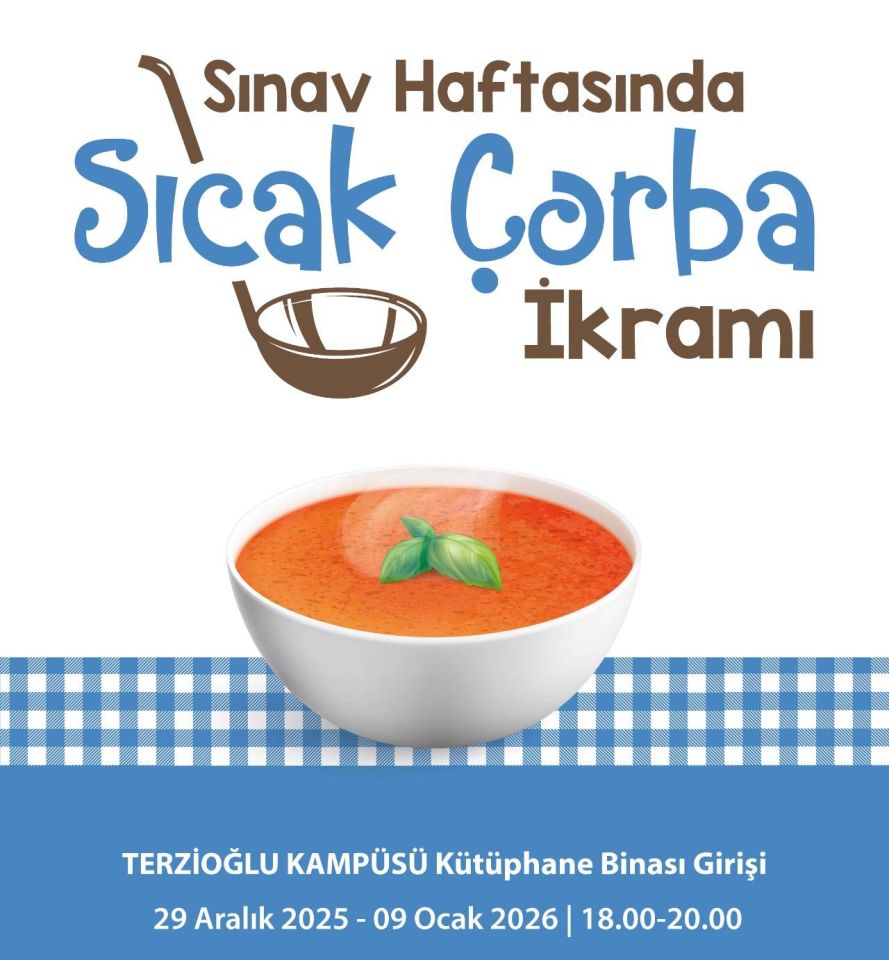 Sıcak çorba ikramları, 29 Aralık 2025 ile 9 Ocak 2026 tarihleri arasında, akşam 18.00 ile 20.00 saatleri arasında ÇOMÜ Terzioğlu Kampüsü Kütüphane Binası girişinde öğrencilere sunulacak.