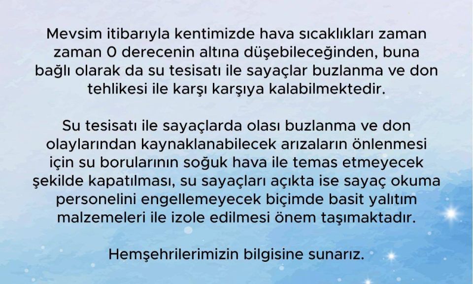 “Mevsim itibarıyla kentimizde hava sıcaklıkları zaman zaman 0 derecenin altına düşebileceğinden, buna bağlı olarak da su tesisatı ile sayaçlar buzlanma ve don tehlikesi ile karşı karşıya kalabilmektedir.