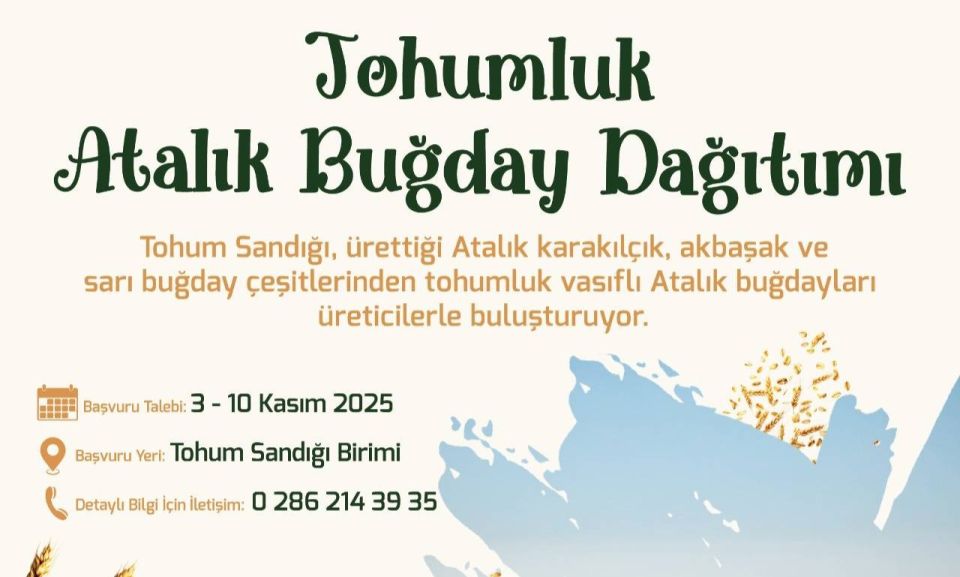 Çanakkale Belediyesi'nin "Tohum Sandığı" projesi kapsamında, çiftçilere geri teslim şartıyla tohumluk vasıflı Atalık Karakılçık, Akbaşak ve Sarı Buğday dağıtılacak. Başvurular şahsen ve belirlenen tarihler arasında yapılacak.