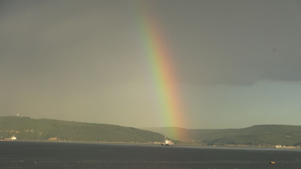 Çanakkale'de dün öğle ve gece saatlerinde aralıklarla devam eden yağmur gündüz yerini kısa süreliğine açık havaya bıraktı. Günün ilk ışıklarıyla birlikte Çanakkale Boğazı'nda çifte gökkuşağı süsledi. Boğazın üzerinde oluşan renk cümbüşü vatandaşları mest etti.