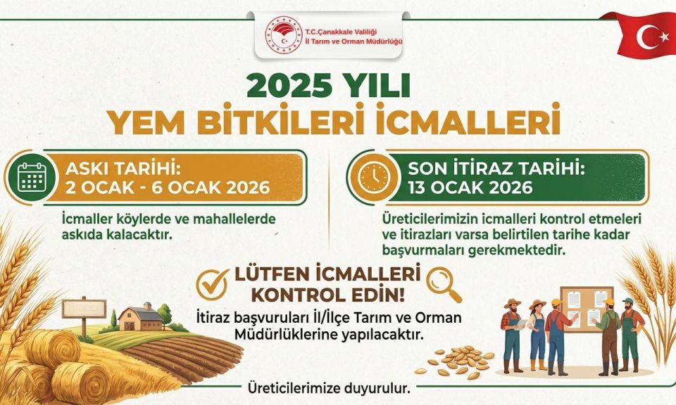 İcmaller, 2 Ocak – 6 Ocak 2026 tarihleri arasında İl ve İlçe Tarım ve Orman Müdürlüklerinde askıda kalacak. Üreticilerin itirazlarını iletebilecekleri son tarih ise 13 Ocak 2026 olarak açıklandı. Çanakkale İl Tarım ve Orman Müdürlüğü yetkilileri, tüm üreticilere bereketli ve verimli bir üretim sezonu diledi.