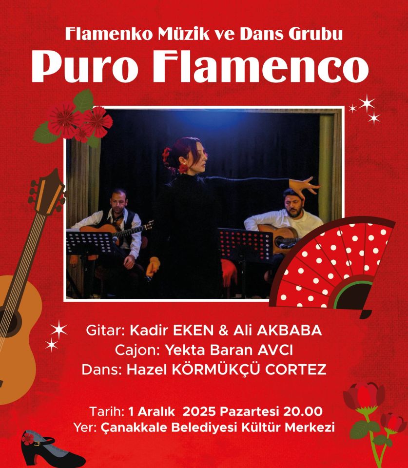 Çanakkale Belediyesi Aralık ayı kültür-sanat etkinlikleri 1 Aralık 2025 Pazartesi akşamı Puro Flamenco Çanakkale Müzik ve Dans Grubu tarafından gerçekleştirilecek dans gösterisi ile başlıyor.
