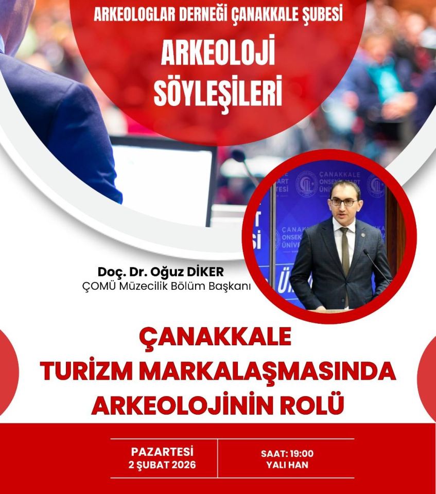 2026 yılının açılış söyleşisinde, Çanakkale Onsekiz Mart Üniversitesi Müzecilik Bölüm Başkanı Doç. Dr. Oğuz Diker konuk olacak. Diker, “Çanakkale Turizm Markalaşmasında Arkeolojinin Rolü” başlıklı sunumuyla; arkeolojik mirasın kent kimliği üzerindeki etkisini, kültürel turizm potansiyelini ve sürdürülebilir markalaşma stratejilerini Çanakkale özelinde katılımcılarla paylaşacak.