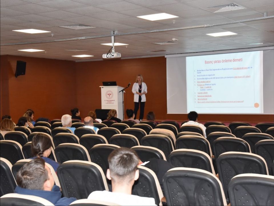Eğitimde basınç yaralarının evreleri, risk değerlendirme yöntemleri, korunma stratejileri, doğru pozisyonlama teknikleri ve kanıta dayalı bakım uygulamaları detaylı şekilde ele alındı. Sağlık personelinin aktif katılımıyla gerçekleşen program, soru–cevap bölümü ile sona erdi.