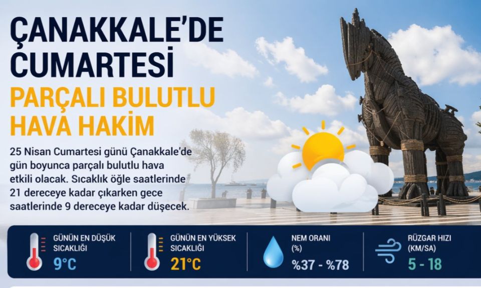 Çanakkale’de 25 Nisan Cumartesi günü için açıklanan hava durumu tahminlerine göre, gün genelinde parçalı bulutlu bir gökyüzü bekleniyor. Sabah saatlerinden itibaren etkisini gösterecek olan bulutlu hava, gün içinde sıcaklıkların kademeli olarak artmasıyla birlikte daha ılıman bir seyir izleyecek.