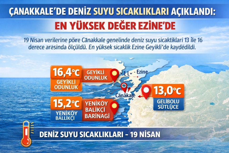 Çanakkale’de deniz suyu sıcaklıklarına ilişkin güncel veriler açıklandı. 19 Nisan günü yapılan ölçümlere göre il genelinde deniz suyu sıcaklıkları bölgelere göre farklılık gösterdi. Ezine ilçesine bağlı Geyikli Odunluk İskele Feneri’nde saat 11.22 itibarıyla deniz suyu sıcaklığı 16.4 derece olarak ölçülerek günün en yüksek değeri kaydedildi. Yine Ezine Yeniköy Balıkçı Barınağı Ana Mendirek Feneri’nde sıcaklık 15.2 derece olarak belirlendi. Çanakkale Merkez’de sabah saat 09.00’da yapılan ölçümde deniz suyu sıcaklığı 13.4 derece olarak kayıtlara geçerken, Gelibolu Sütlüce Limanı Kuru İskele’de ise saat 11.22 itibarıyla sıcaklık 13.0 derece ölçüldü.