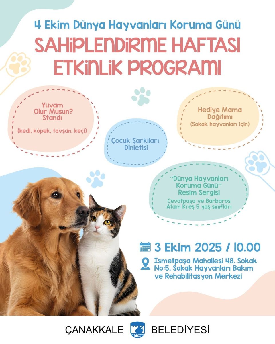Çanakkale Sokak Hayvanları Bakım ve Rehabilitasyon Merkezi, 3 Ekim 2025 Cuma günü saat 10.00’da “Dünya Hayvanları Koruma Günü” kapsamında özel bir etkinliğe ev sahipliği yapacak. İsmetpaşa Mahallesi 48. Sokak No:5 adresinde gerçekleşecek program, tüm hemşehrilere açık olacak.