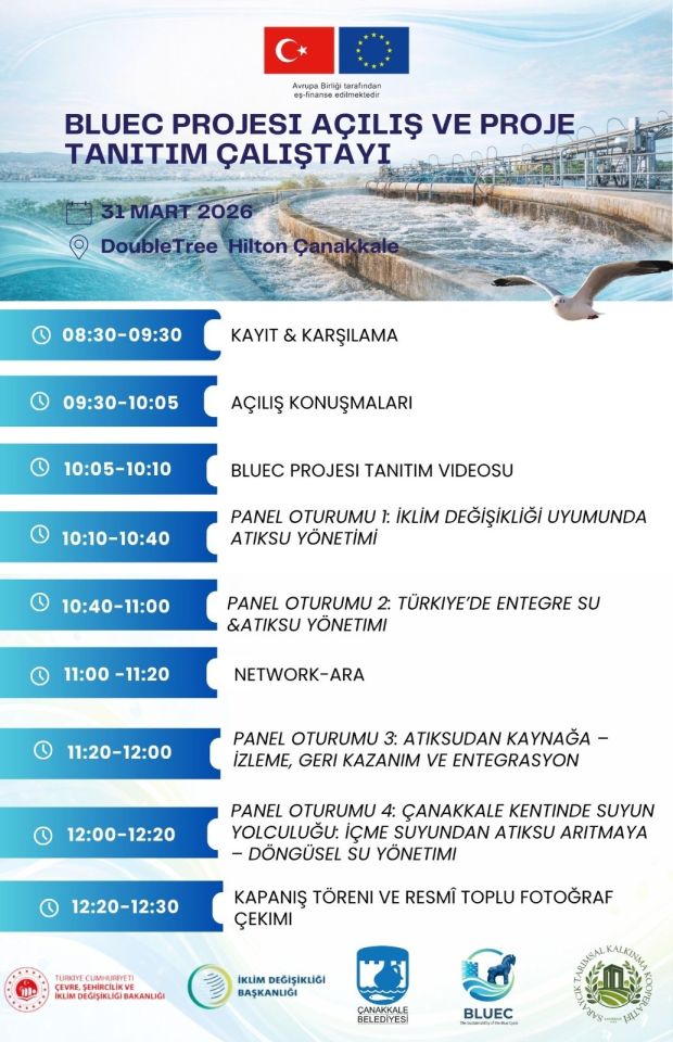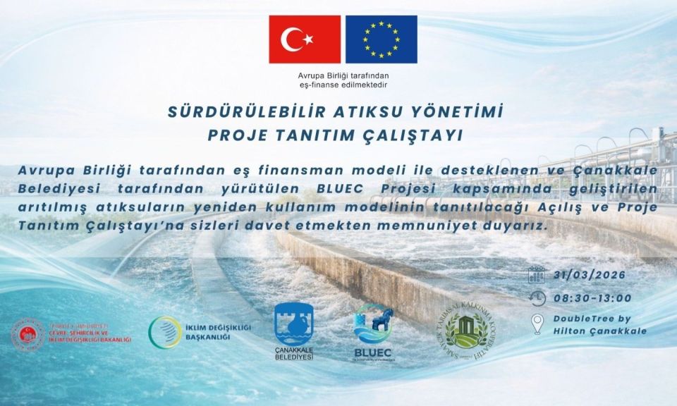 Avrupa Birliğinin eş finansman mteli ile desteklenen ve Çanakkale Belediyesi tarafından yürütülen BLUEC Projesi kapsamında geliştirilen arıtılmış Arıtılmış atık suların yeniden kullanım modelinin tanıtılacağı Sürdürülebilir Atıksu Yönetimi Projesi Tanıtım Çalıştayı 31 Mart 2026 Salı günü gerçekleştirilecek.