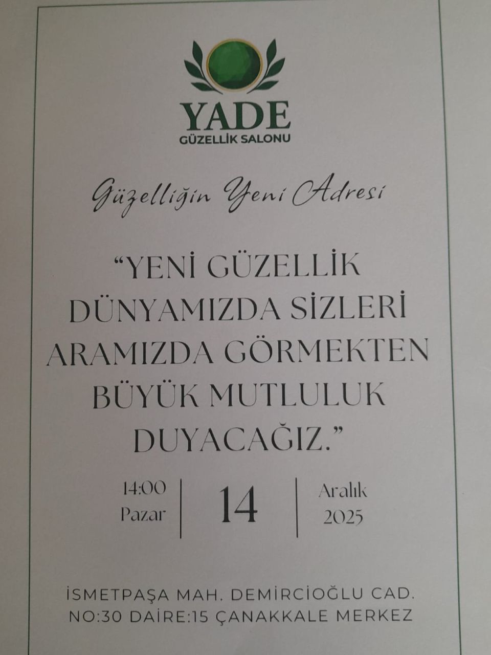 Çanakkale’de kişisel bakım ve güzellik alanına yeni soluk katacak bir işletme kapılarını açmaya hazırlanıyor. YADE Güzellik Salonu, modern hizmet anlayışı ve estetik atmosferiyle kentte güzelliğin yeni adresi olma iddiasıyla hizmete giriyor.